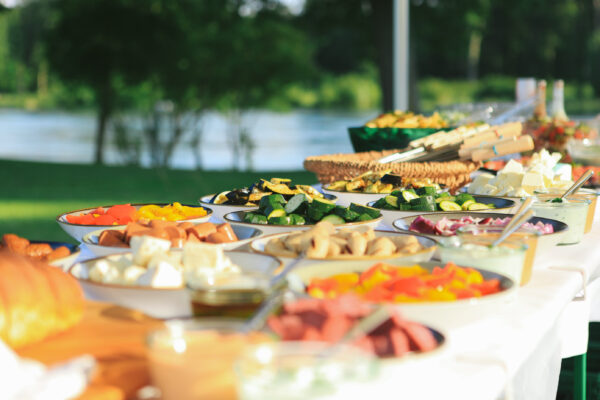 Das Catering funktioniert als Selbstbedienung. Besteck, Geschirr und Gläser stehen bereit. Unser Team sorgt dafür, dass das Buffet aufgefüllt wird und von allem genug vorhanden ist.